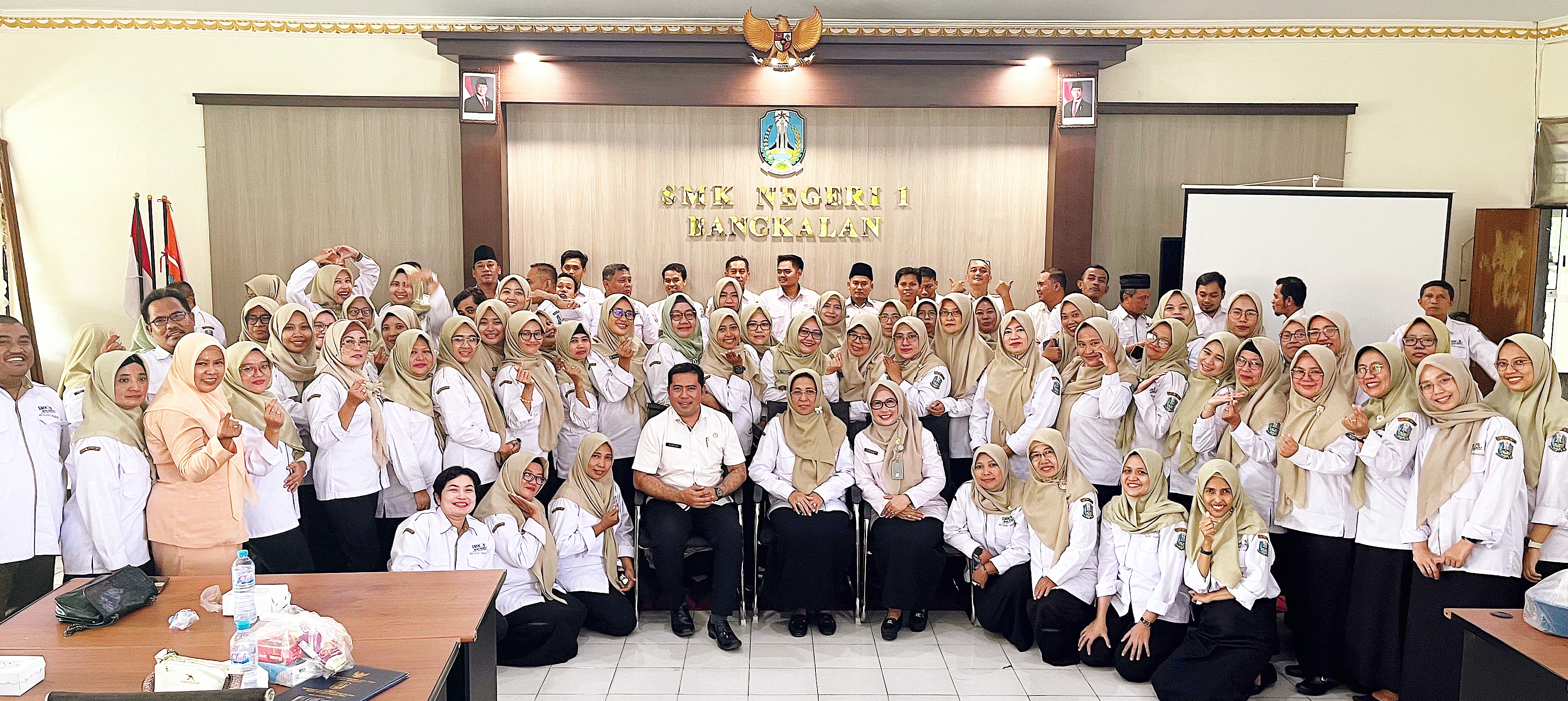 Momen sakral peralihan tongkat estafet ini terasa makin istimewa dengan kehadiran sejumlah saksi penting. Tampak hadir Pengawas Cabang Dinas Pendidikan Wilayah Bangkalan, Bapak Hamzah, M.Pd., bersama Ibu Lilis Purwantiningsri, S.E., M.M., serta Ketua Dharma Wanita. Kehadiran mereka menjadi bukti dukungan moral bagi transisi kepemimpinan di sekolah kejuruan rujukan tersebut.